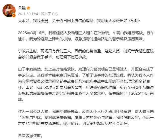 大家好,我是金晨,关于近日网上流传的消息,我想向大家做出如下说明:2025年3月16日,我和经纪人及助理三人租车在外游玩,车辆由我进行驾驶。行车途中,我为躲避路上蹿出的小狗,紧急拐弯时撞向路边的警示牌及房屋围墙。事故发生时,现场只有我们三人,因我的伤势较重,经纪人第一时间带我赶往医院急诊并紧急做了手术,助理留下处理事故。由于事发突然,加上当时情绪紧张,助理向交警说明自己是驾驶人,并配合完成了事故认定。当我手术结束意识恢复后,了解了该事件的处理过程,我认为我本人作为实际驾驶员必须承担全部事故责任及为此次事故中出现的不当处理承担全部责任。因此,我让助理立即联系保险公司,申请撤销保险理赔,所有车损费用及路边设施和房屋围墙相关方的经济损失由我本人全额承担作为一名公众人物,我未能做好表率,反而因个人行为占用社会资源,给大家带来了困扰与担忧,我对此深感惭愧。感谢大家的关心与监督,我会深刻反省,今后一定更加严格遵守交通法规,谨言慎行,切实承担起应尽的社会责任。再次诚恳致歉。